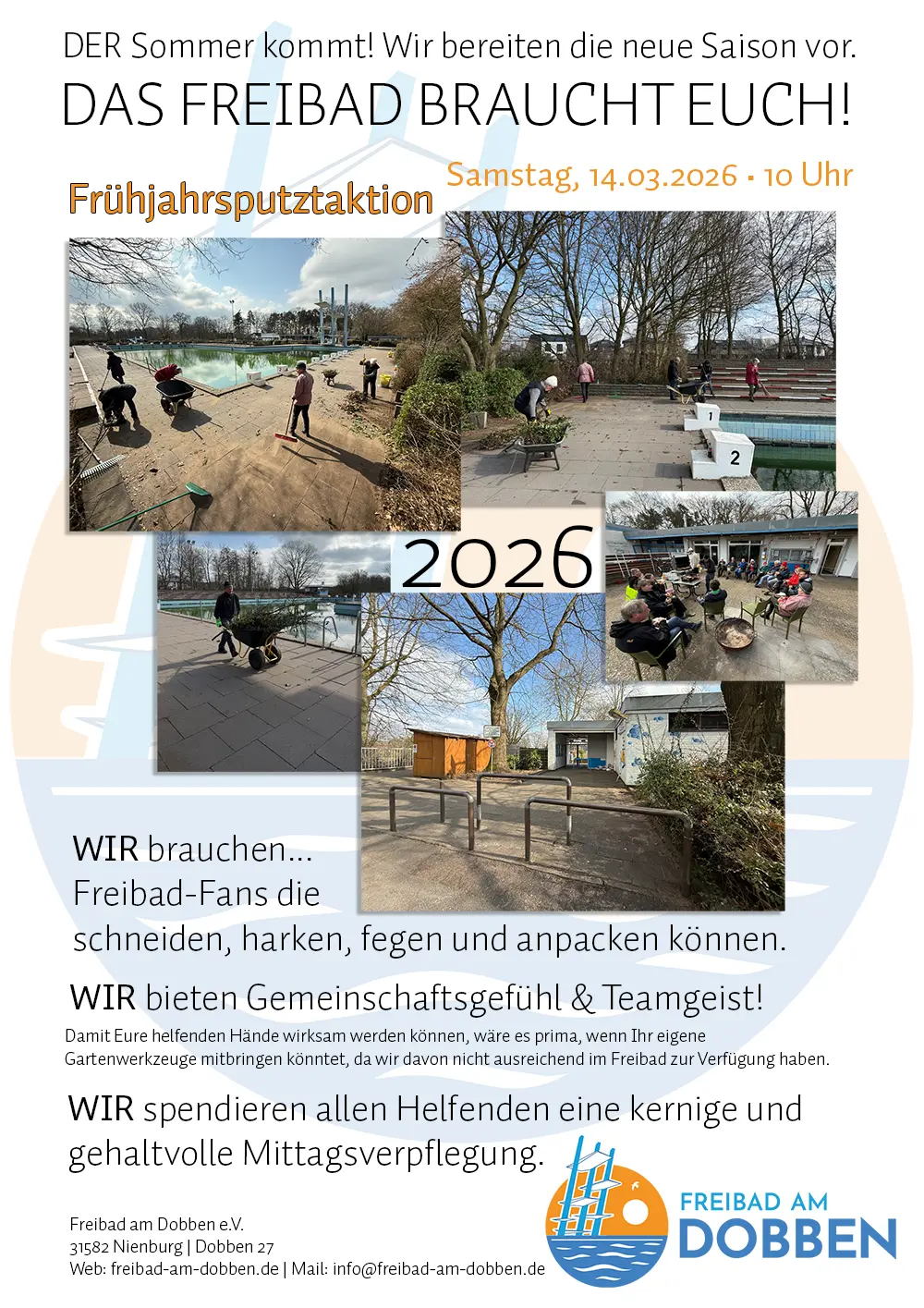 Aufruf an alle, die Lust haben, das Freibad für einen neue Saison herauszuputzen. Laub haken, Büsche- und Bäume schneiden. Fegen und Aufräumen. Die Becken aus dem […]